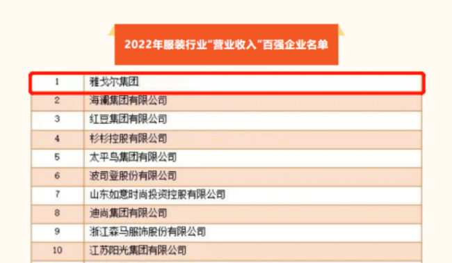 雅戈爾再度榮登榜首!中國服裝協(xié)會公布“2022年服裝行業(yè)百強企業(yè)”