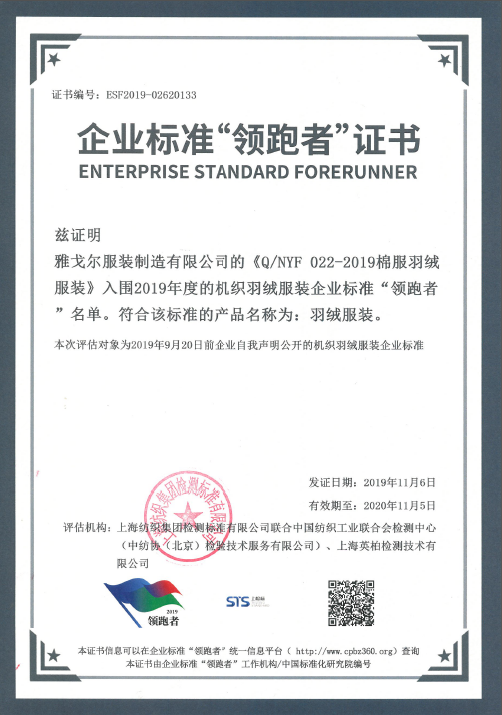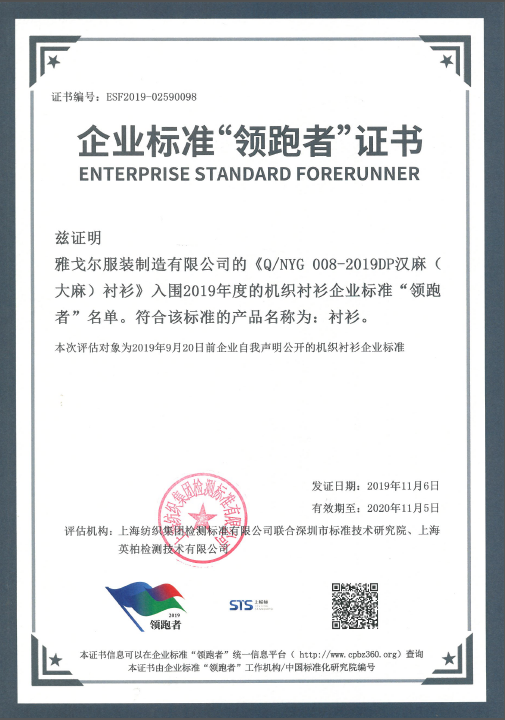 2019年11月6日,2019企業(yè)標準領跑者年度大會在山東濟南召開,會議公布第一批企業(yè)標準“領跑者”名單,雅戈爾DP漢麻襯衫成為機織襯衫企業(yè)標準“領跑者”,棉服羽絨服成為機織羽絨服裝“領跑者”。